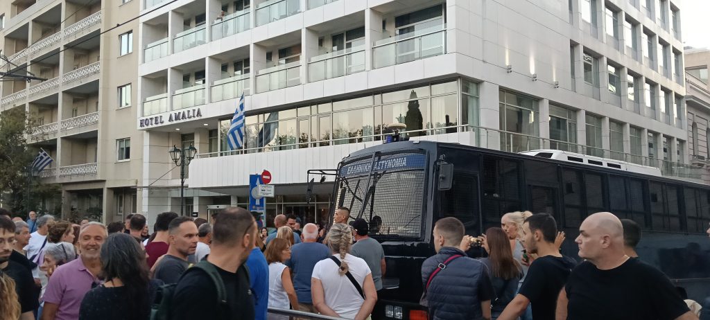 Αφού ξεπέρασα το πρώτο ας πούμε εμπόδιο, του κλεισίματος του σταθμού στο Σύνταγμα και περπάτησα , κάνοντας και την βόλτα μου η αλήθεια είναι , έφθασα στο σημείο λίγο πριν την έναρξη των ομιλιών και κινούμενος μέσα στον κόσμο έφθασα μέχρι έξω από το ξενοδοχείο Αμαλία , λίγο πριν την Βουλή , όπου εκεί στάθμευαν 3 κλούβες των ΜΑΤ .